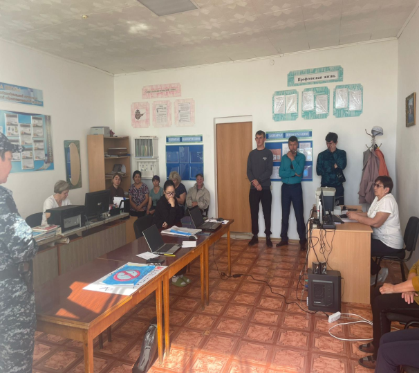 Ушаково ауылдық округінің учаскелік полиция инспекторы О.А. Құрмашев, педагогикалық ұжыммен әңгіме жүргізді; тұрмыстық зорлық-зомбылық, интернетке тәуелділік сияқты өзекті тақырыптар қозғалды